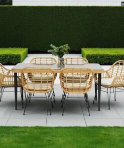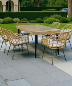 6-Seater Modern Outdoor Dining Set – Beige Rattan-Style Chairs with Steel Frame & Glass-Top Table