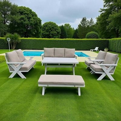 9-Seater Cross Legs White Aluminium Garden Sofa with Big Table