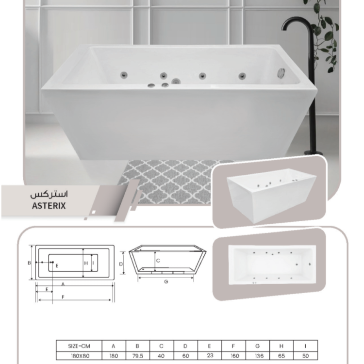 Asterix Acrylic Freestanding Jacuzzi Bathtub – 180 × 80 cm (Glossy White)