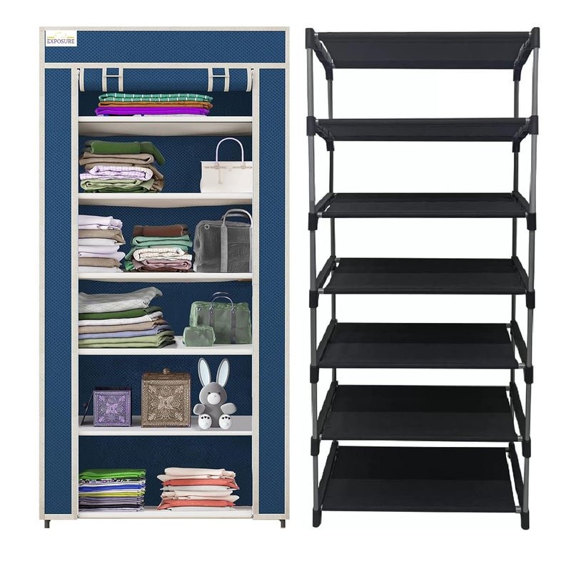 Exposure 6-Layer Collapsible Wardrobe Storage Rack | Multipurpose Cloths Organizer with Metal Frame | Lightweight Foldable Fabric Closet Cupboard for Bedroom, Living Room, or Hostel (Blue)