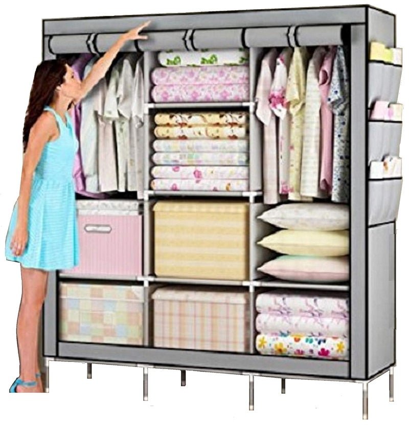 GRAZIA Portable Foldable Wardrobe Cabinet Collapsible Storage Almirah with DIY Rack Bigger and Better with Side Pockets on Both-Side – Grey