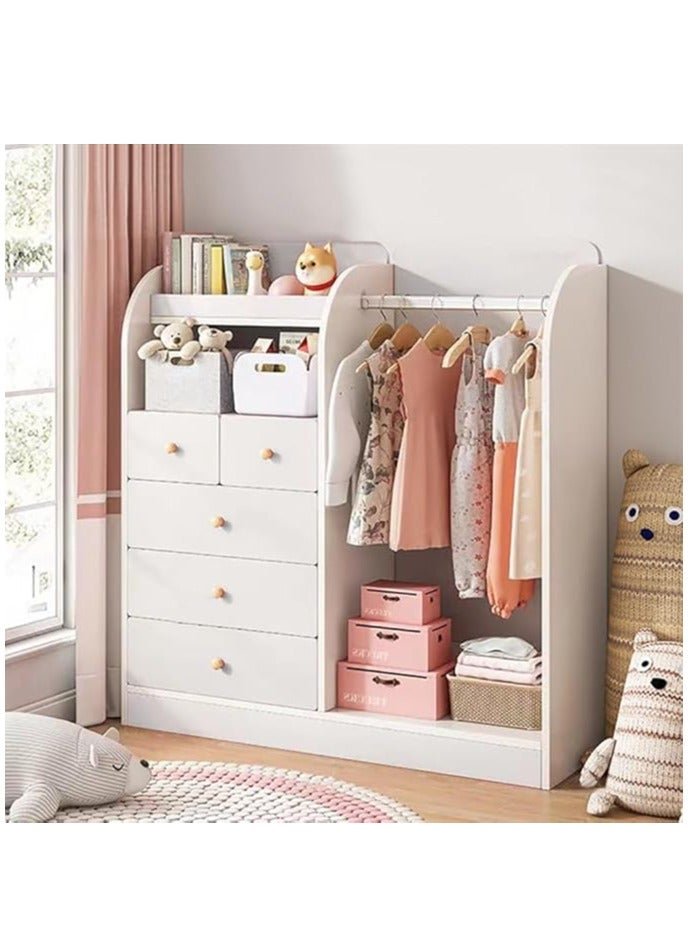 Kids Wardrobe, Bedroom Cabinet Wooden Closet with 5 Drawers and Hanging Area for Clothes, Half-Open Baby Clothes Storage Organizer Cabinet Cupboard for Boys Girls Nursery Room (White)