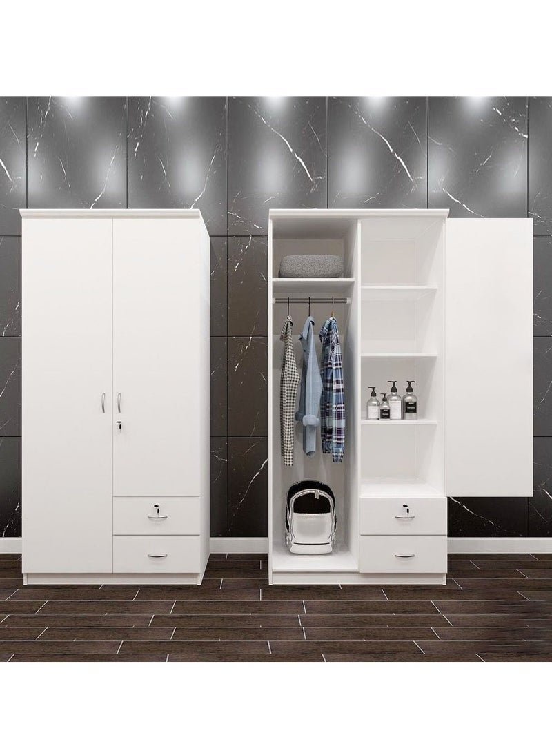 KUSTOMDECO 2 Door Wooden Wardrobe Cabinet | Engineered Wood Bedroom Cupboard with Hanging Space, Shelves & Drawers | Modern White Wardrobe