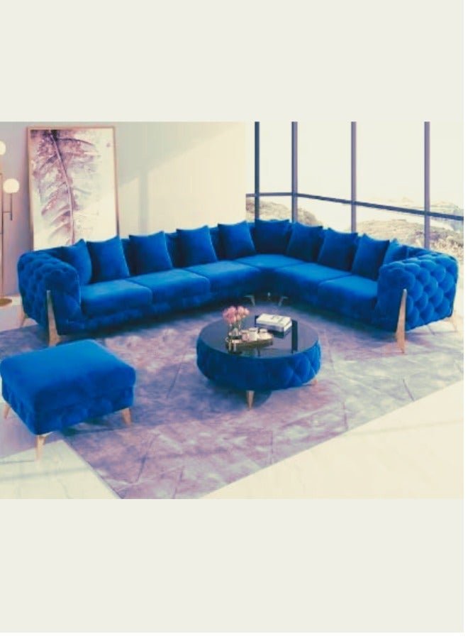 Maharat Al Bahar Golden-Legged L-Shaped Chesterfield Velvet Sofa Set Luxury Living Room Blue 6 Seater