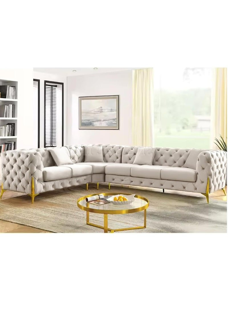 Maharat Al Bahar Luxury L-Shaped Cream Velvet Chesterfield Sofa – 6-Seater with Golden Legs – Timeless Elegance for Refined Living Spaces