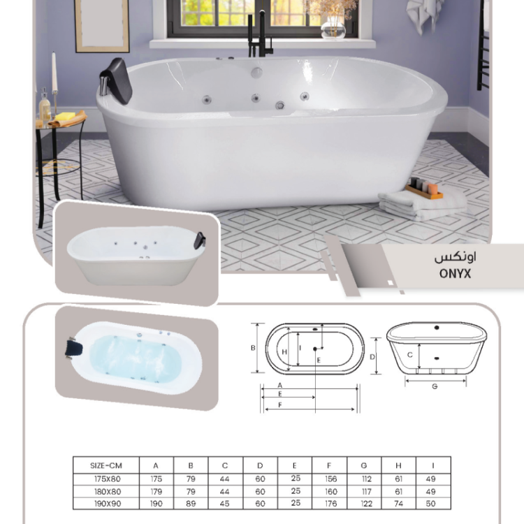 Onyx Acrylic Freestanding Jacuzzi Bathtub – Glossy Finish | 190 × 90 cm, 180 × 80 cm, 175 × 80 cm