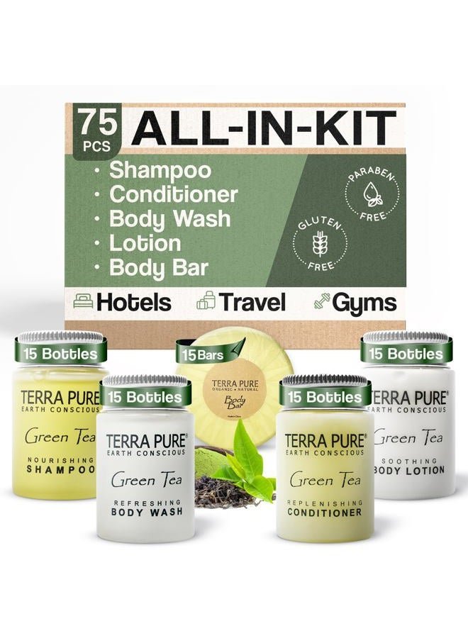 Terra Pure Hotel Soaps and Toiletries Bulk Set | 1-Shoppe All-In-Kit Amenities for Hotels | 1oz Hotel Shampoo & Conditioner, Body Wash, Body Lotion & 1.25oz Bar Soap Travel Size Toiletries | 75 Pieces