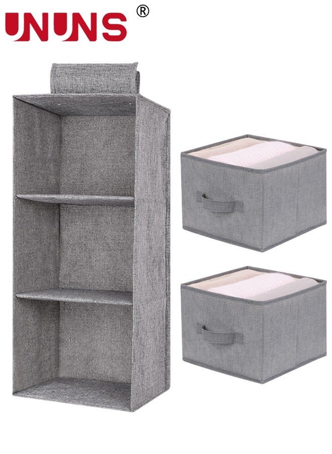 UNUNS Hanging Closet Organizer Storage Shelves,Wardrobe Storage Hanging Bag,Clothes Organizer Closet Shelf,3 Shelf Closet Storage With 2 Storage Drawers,Classification Closet Storage Organizer,Grey